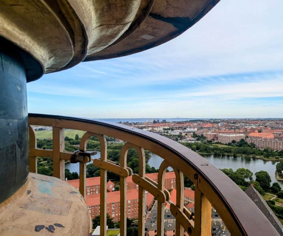 Paskutiniai keli laipteliai buvo tik tiek platūs, kad vienas žmogus vienu metu galėtų prisispausti. Pralenkiau saujelę nervingų turistų, kurie aiškiai susimąstė, ir užlipau tiesiai į viršūnę, kur buvau apdovanotas vienu geriausių Kopenhagos vaizdų – 360° panoraminiu vaizdu į miestą ir už jo ribų.