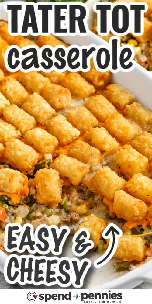 Seasoned ground beef and veggies are mixed in a creamy sauce and topped with melty cheddar and crispy tater tots.